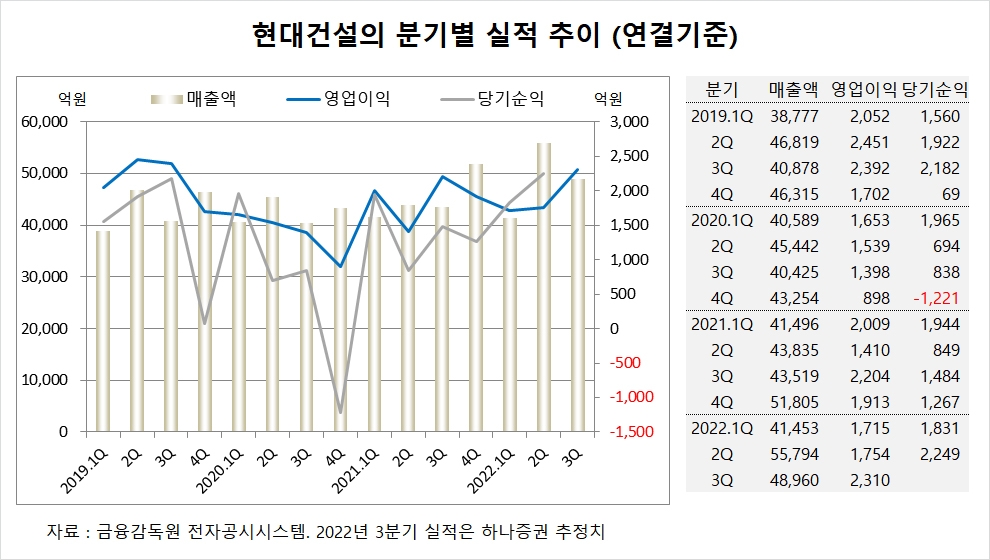 하나증권은 현대건설의 올해 3분기 연결기준 매출액이 4조8960억원, 영업이익이 2310억원에 이를 것으로 내다보고 있습니다.