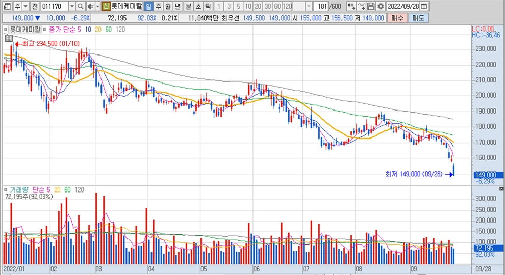 이미지 확대보기롯데케미칼의 주가는 28일 장 시작과 동시에 4000원(2.52%) 하락한 15만5000원에 시가가 형성됐고 오전 9시 3분 현재 전일보다 1만원(6.29%) 내린 14만9000원에 거래되고 있습니다.