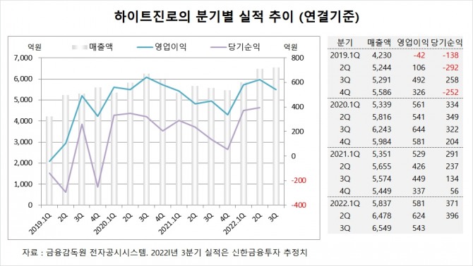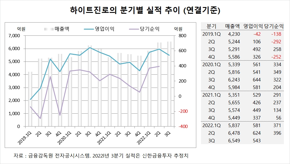 신한금융투자는 하이트진로의 올해 3분기 연결기준 매출액이 6549억원, 영업이익이 543억원에 이를 것으로 내다보고 있습니다.