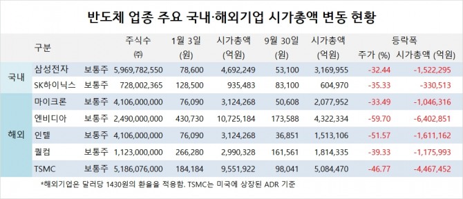 해외 반도체 기업들의 시가총액은 국내 반도체 기업들에 비해 더 많이 떨어졌는데 엔비디아의 하락폭이 가장 컸습니다. 해외 기업의 주가에는 달러당 1430원의 환율이 적용됐습니다.