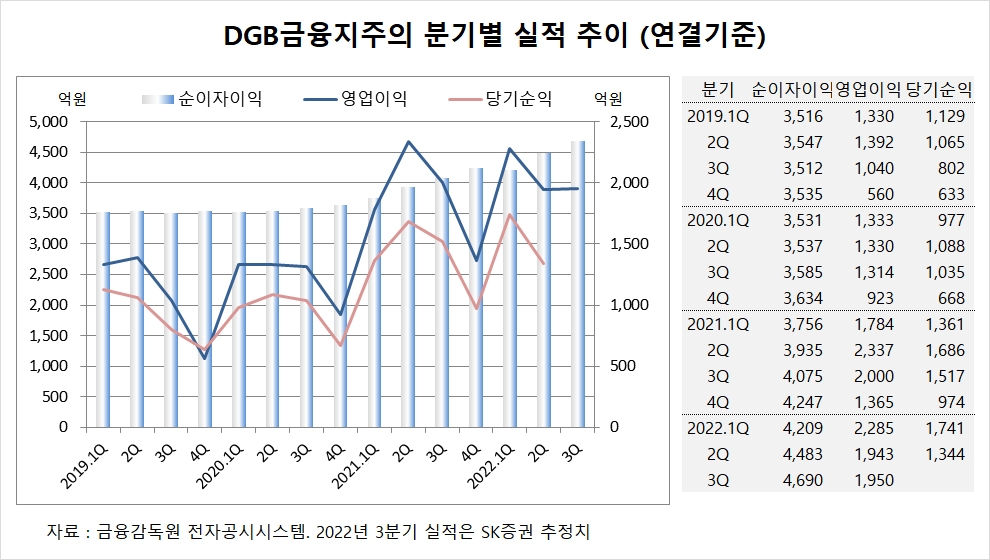 SK증권은 DGB금융지주의 올해 3분기 연결기준 순이자이익이 4690억원, 영업이익이 1950억원에 이를 것으로 내다보고 있습니다. DGB금융지주의 3분기 영업이익 시장 컨센서스는 2270억원입니다.