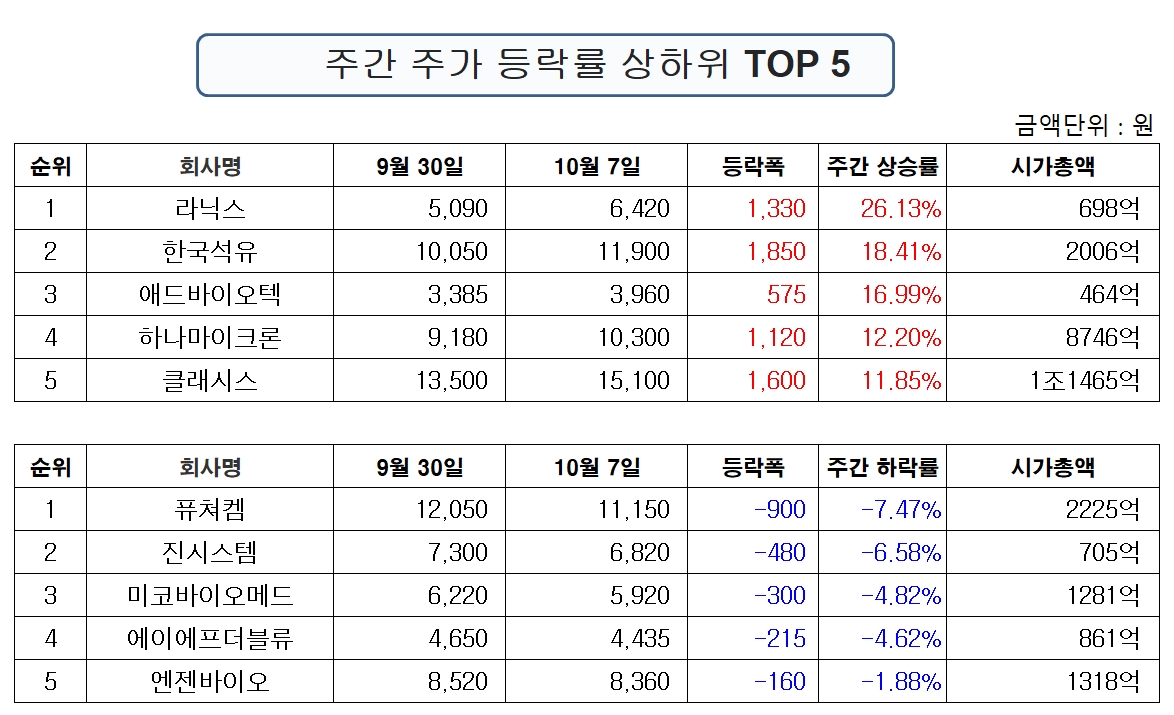 1위 라닉스 6420원 +1330원 (26.13%) ▲2위 한국석유 1만1900원 +1850원 (18.41%) ▲3위 애드바이오텍 3960원 +575원 (16.99%) ▲4위 하나마이크론 1만300원 +1120원 (12.2%) ▲5위 클래시스 1만5100원 +1600원 (11.85%)