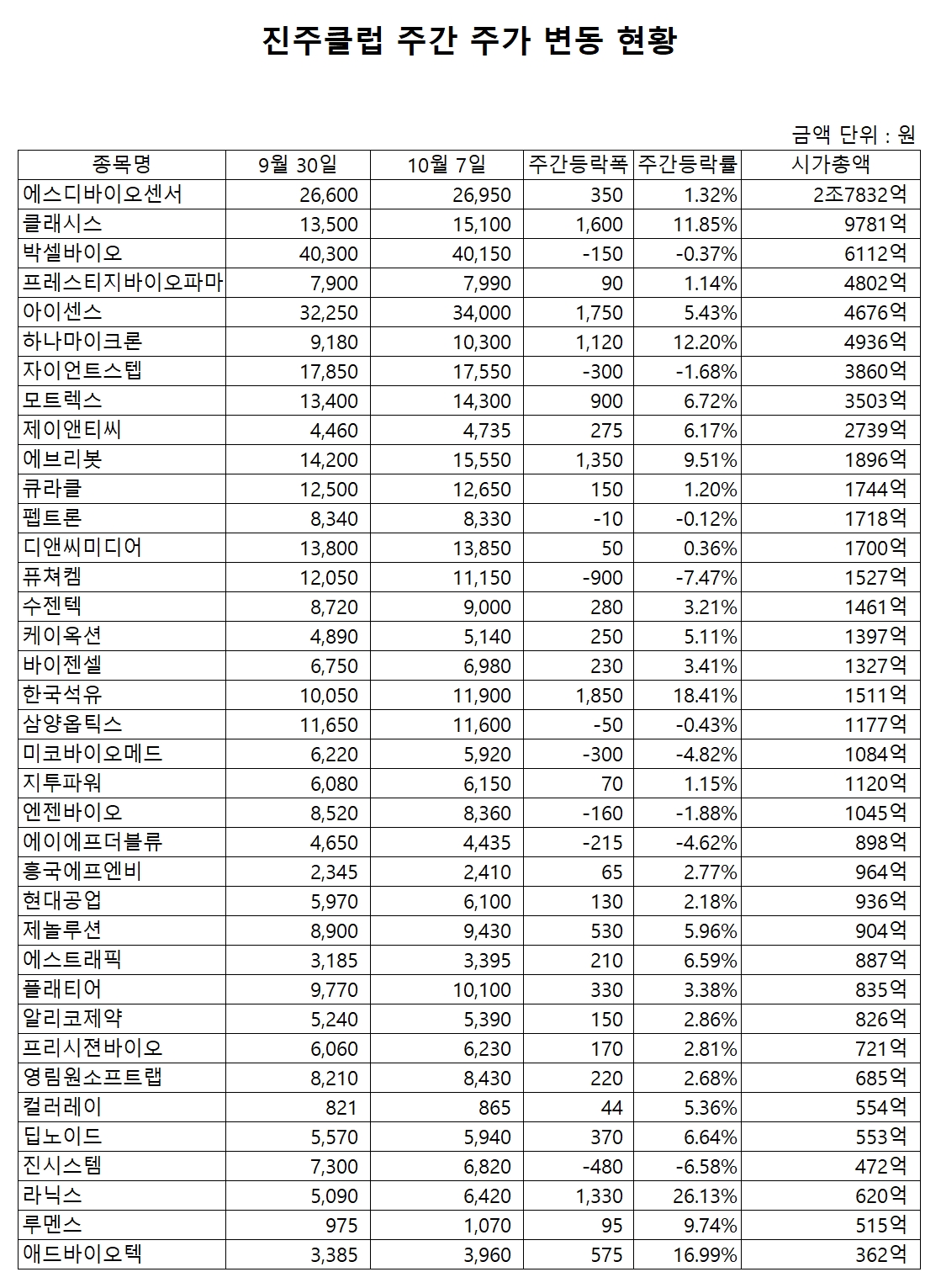 이미지 확대보기주간 기준 진주클럽 구성종목 중 상승률 상위종목은 다음과 같다.