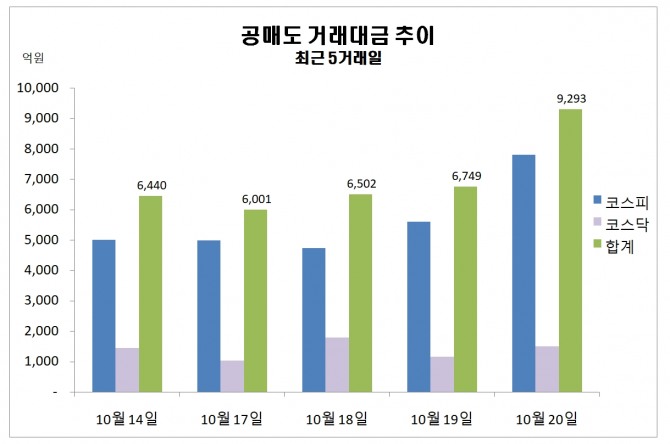 이미지 확대보기21일 한국거래소에 따르면 지난 20일 주식시장에서 공매도 거래대금 규모는 9292억원을 기록했다.