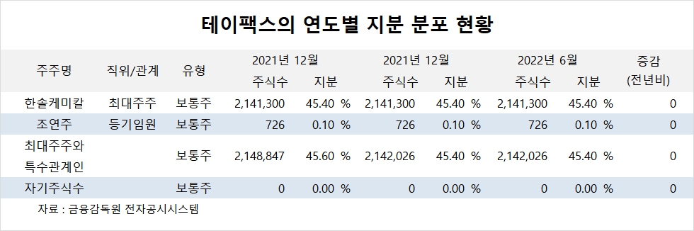 이미지 확대보기테이팩스의 최대주주는 한솔케미칼로 지분 45.40%를 보유하고 있습니다.