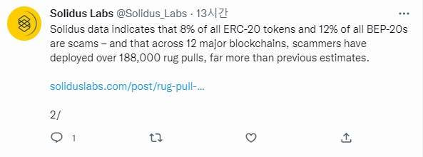 이미지 확대보기암호화폐 위험 모니터링 회사인 솔리더스 랩스(Solidus Labs)가 최근 발표한 연구에 따르면 2020년 8월 이후 약 20만 건의 크립토 러그 풀(rug pull, 가상 자산 개발자가 프로젝트에 대한 투자금을 모은 뒤 돌연 프로젝트를 중단하고 투자금은 돌려주지 않는 사기)과 분산 금융(DeFi) 사기를 신고했다고 밝혔다.
