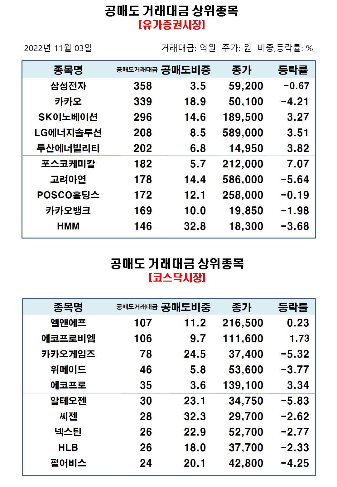 코스닥시장에서 공매도 거래량 상위종목은 카카오게임즈 20만주, 에코프로비엠 9만주, 국일제지 9만주, 씨젠 9만주, 한국비엔씨 9만주, 위메이드 8만주, 알테오젠 8만주, CMG제약 8만주, 비에이치 7만주, HLB 6만주 순으로 집계됐다.