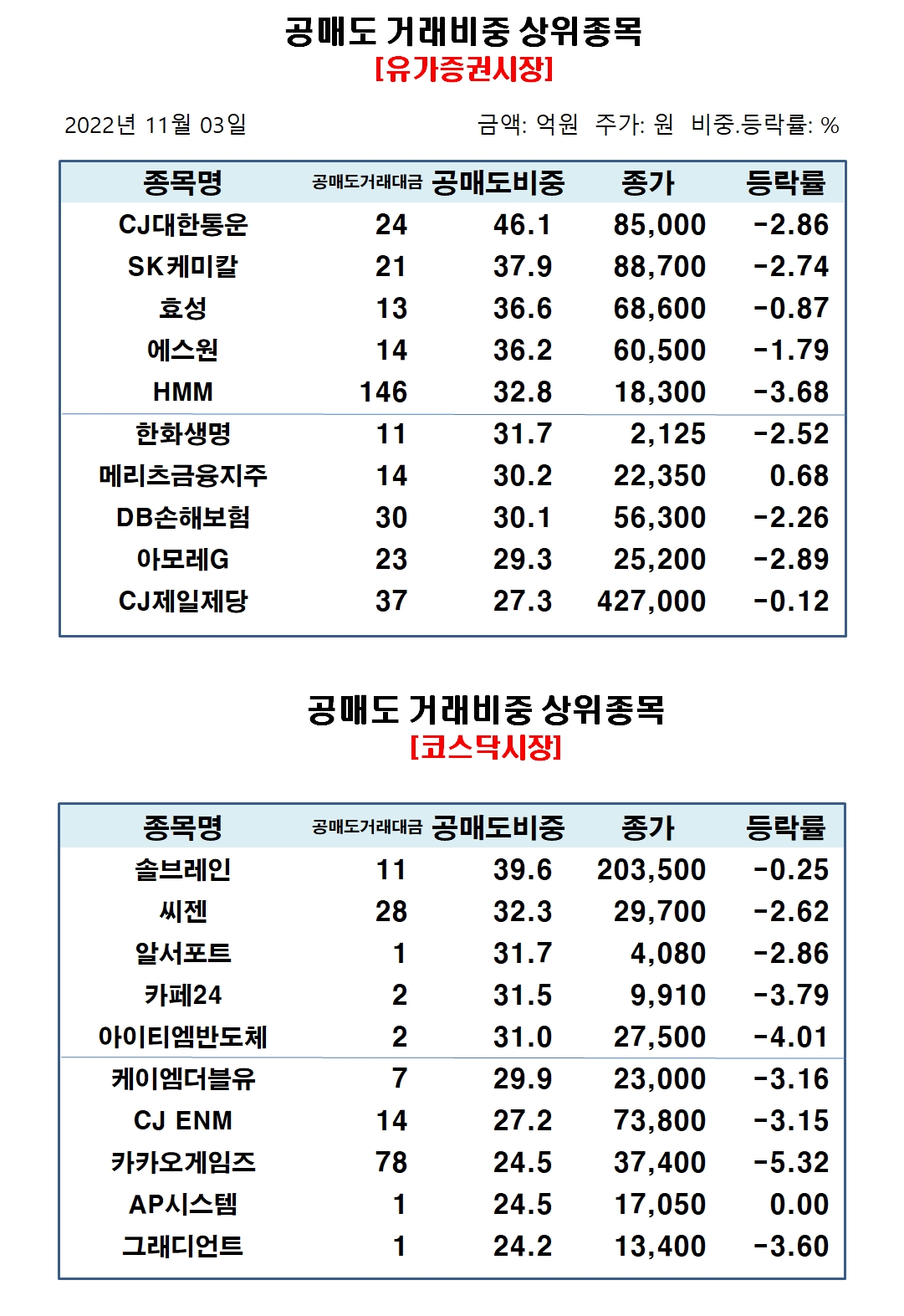 이미지 확대보기유가증권시장에서 공매도 거래비중 상위종목은 CJ대한통운 46.14%, SK케미칼 37.87%, 효성 36.63%, 에스원 36.15%, HMM 32.79%, 한화생명 31.73%, 메리츠금융지주 30.23%, DB손해보험 30.12%, 아모레G 29.27%, CJ제일제당 27.33% 순으로 집계됐다.
