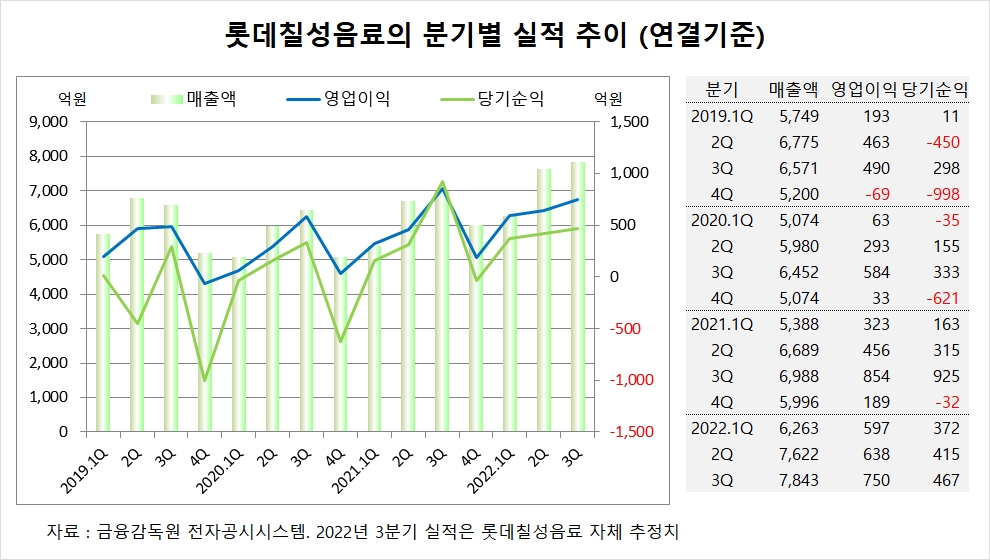 이미지 확대보기롯데칠성은 올해 3분기 실적을 잠정 집계한 결과 연결기준 매출액이 7843억원, 영업이익이 750억원, 당기순이익이 467억원에 이를 것이라고 공시했습니다. 롯데칠성의 3분기 영업이익은 시장 컨센서스인 917억원을 하회했습니다.