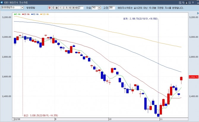 이미지 확대보기항셍지수는 11일 전일 대비 1244.62 포인트, 7.74% 급등한 1만7325.66으로 폐장했다. 4거래일 만에 크게 상승 반전하면서 1개월래 최고치를 기록했다.