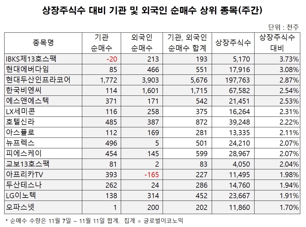이미지 확대보기13일 글로벌이코노믹이 지난 한주간 기관과 외국인투자자 순매수 종목을 분석한 결과 11월 7일부터 11월 11일까지 기관투자자들은 현대에버다임 주식을 8만5000주 가량 사들였다.