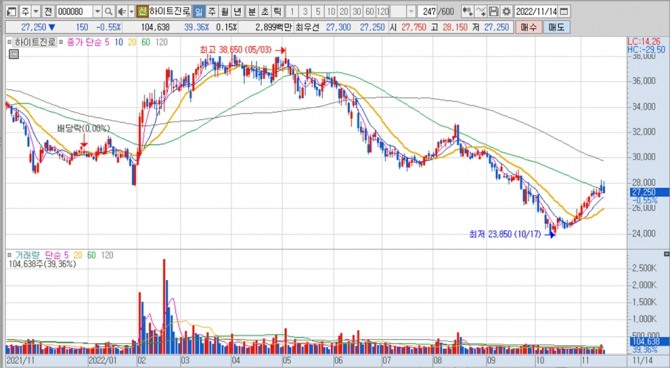 이미지 확대보기하이트진로의 주가는 14일 오전 9시 40분 현재 전 거래일보다 150원(0.55%) 내린 2만7250원에 매매되고 있습니다.