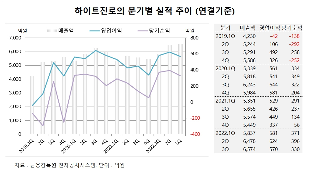 신한투자증권 조상훈 연구위원은 하이트진로가 3분기에 가격 인상 효과까지 반영되며 맥주와 소주 매출이 각각 8%, 24% 증가했지만 화물연대 파업 관련 인건비와 운송비 부담, 임단협에 따른 인건비, 광고판촉비 투입이 더해지며 매출 증가에 따른 레버리지 효과를 누리지 못했다고 분석했습니다.