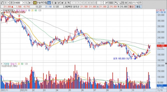 이미지 확대보기한솔케미칼의 주가는 16일 오전 9시 30분 현재 전일보다 1500원(0.71%) 오른 21만1500원에 거래되고 있습니다.