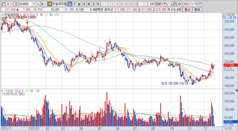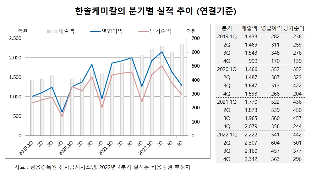 키움증권 박유악 연구원은 한솔케미칼이 올해 4분기 반도체용 과산화수소의 수익성 회복을 시작으로 2023년에는 프리커서, QD소재, 이차전지 바인더·음극재 등의 신사업 확대 모멘텀이 연이어지기 때문에 현 시점이 한솔케미칼에 대한 투자 적기로 판단하고 있습니다.
