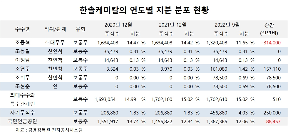 이미지 확대보기한솔케미칼은 조동혁 회장의 장녀 조연주 부회장이 지분 1.42%를 갖고 있습니다.