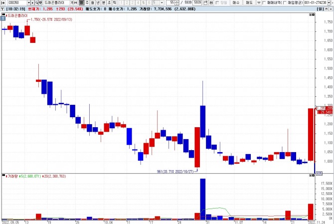 이미지 확대보기24일 한국거래소에 따르면, 이날 오전 10시 23분 현재 드래곤플라이 주가는 전거래일 보다 29.54% 상승한 1285원에 거래되고 있다.