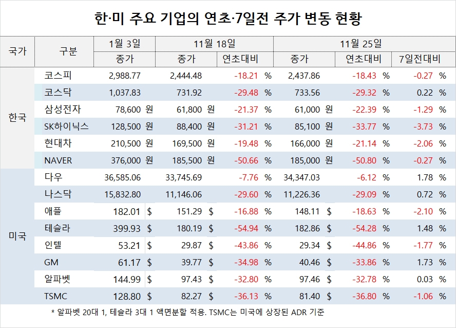 SK하이닉스는 8만5100원으로 연초보다 33.77% 내렸고 일주일 동안 3.73% 하락했습니다. 현대자동차의 주가는 16만6000원으로 연초보다 21.14%, 일주일간 2.06% 각각 하락했습니다.
