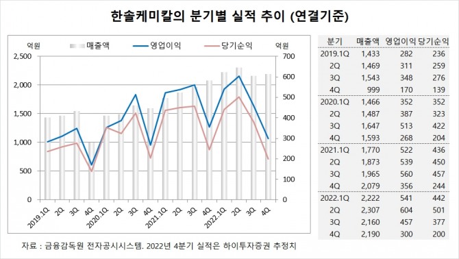하이투자증권은 한솔케미칼의 올해 4분기 연결기준 매출액이 2190억원, 영업이익이 300억원, 당기순이익이 200억원에 이를 것으로 내다보고 있습니다.