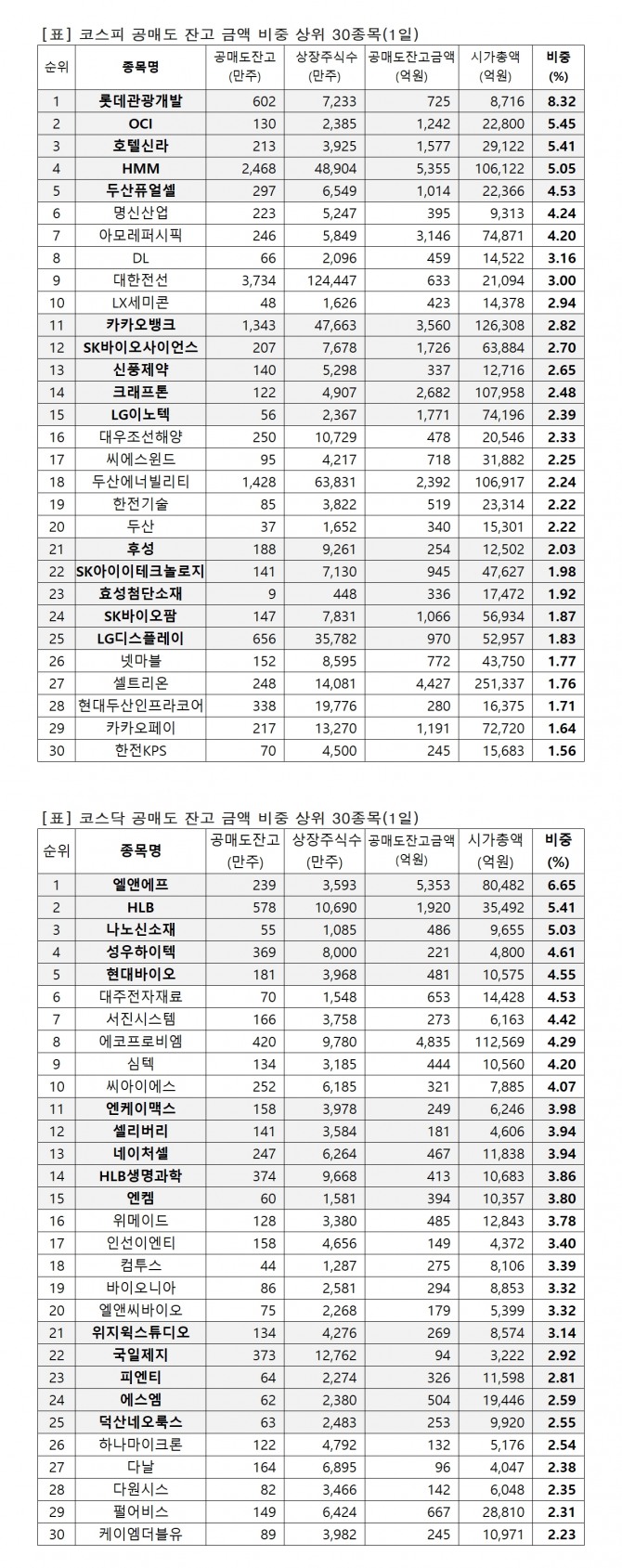 1위 롯데관광개발 725억원(8.32%), 2위 OCI 1241억원(5.45%), 3위 호텔신라 1576억원(5.41%), 4위 HMM 5355억원(5.05%), 5위 두산퓨얼셀 1013억원(4.53%), 6위 명신산업 395억원(4.24%), 7위 아모레퍼시픽 3145억원(4.2%), 8위 DL 459억원(3.16%), 9위 대한전선 632억원(3.0%), 10위 LX세미콘 422억원(2.94%), 11위 카카오뱅크 3559억원(2.82%), 12위 SK바이오사이언스 1726억원(2.7%), 13위 신풍제약 336억원(2.65%), 14위 크래프톤 2681억원(2.48%), 15위 LG이노텍 1770억원(2.39%)