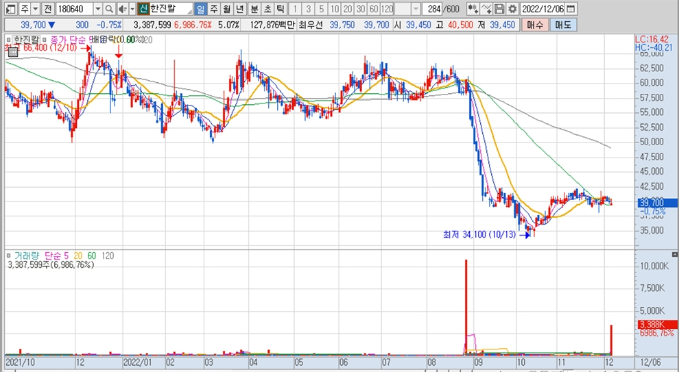 한진칼의 주가는 6일 전일보다 300원(0.75%) 내린 3만9700원에 장을 마쳤습니다.