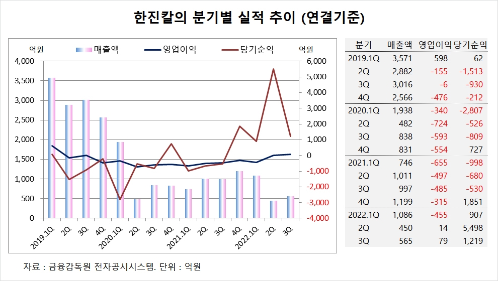 이미지 확대보기한진칼은 올해 3분기 실적을 집계한 결과 연결기준 매출액이 565억원, 영업이익이 79억원, 당기순이익이 1219억원을 기록했다고 공시했습니다.