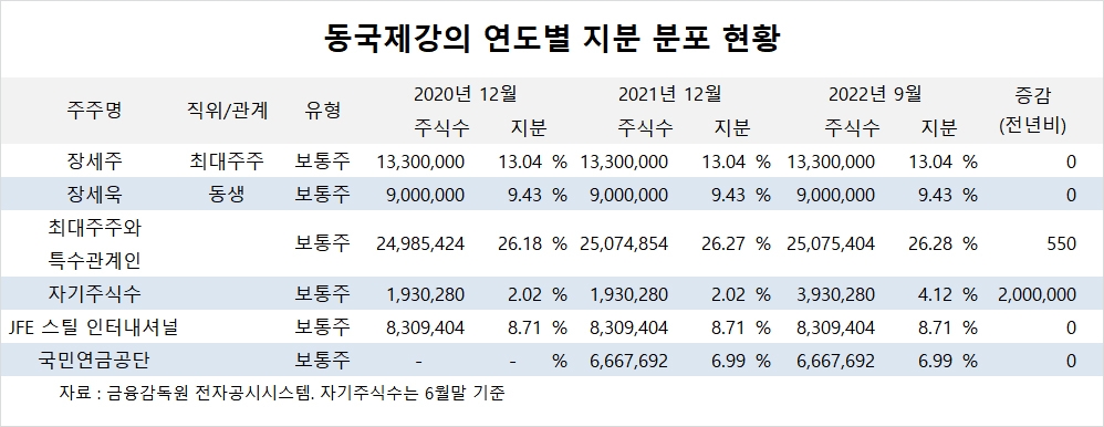 이미지 확대보기동국제강의 최대주주는 장세주 회장으로 지분 13.04%를 보유하고 있습니다.