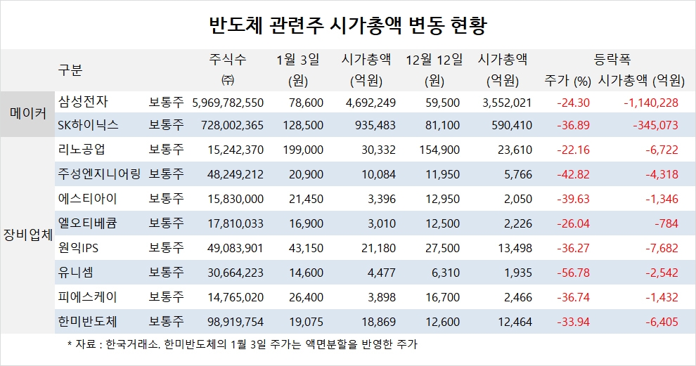 삼성전자의 주가는 12월 12일 5만9500원으로 연초인 1월 3일의 7만8600원보다 24.30% 하락했고 SK하이닉스의 주가는 연초보다 36.89% 내린 수준입니다.
