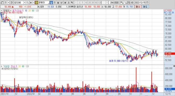 이미지 확대보기코웨이의 주가는 15일 오전 10시 10분 현재 전일보다 900원(1.61%) 오른 5만6900원에 거래되고 있습니다.