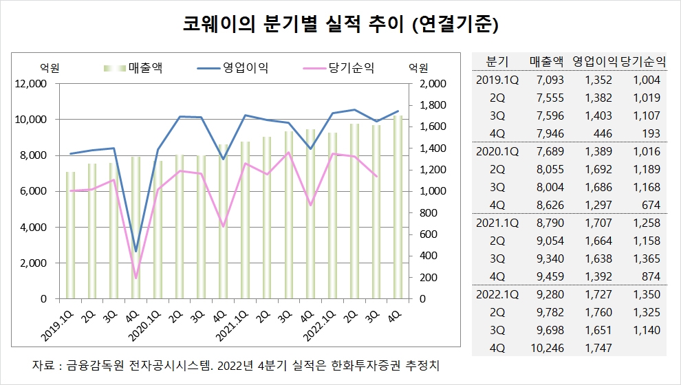 코웨이는 올해 3분기 연결기준 매출액이 9698억원, 영업이익이 1651억원, 당기순이익이 1140억원을 기록했습니다.