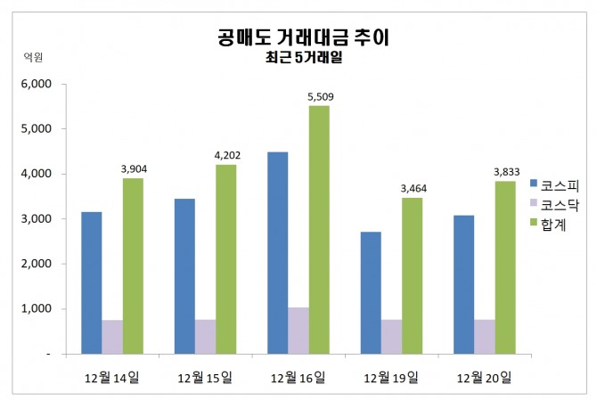 21일 한국거래소에 따르면 지난 20일 주식시장에서 공매도 거래대금 규모는 3833억원을 기록했다.
