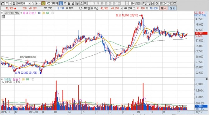 이미지 확대보기LX인터내셔널의 주가는 22일 오전 9시 25분 현재 전일보다 250원(0.62%) 오른 4만900원에 매매되고 있습니다.