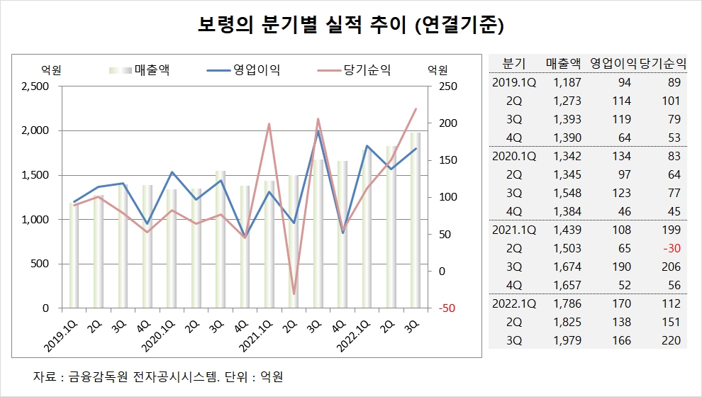 이미지 확대보기보령은 올해 3분기 실적을 집계한 결과 연결기준 매출액이 1979억원, 영업이익이 166억원, 당기순이익이 220억원을 기록했다고 공시했습니다.