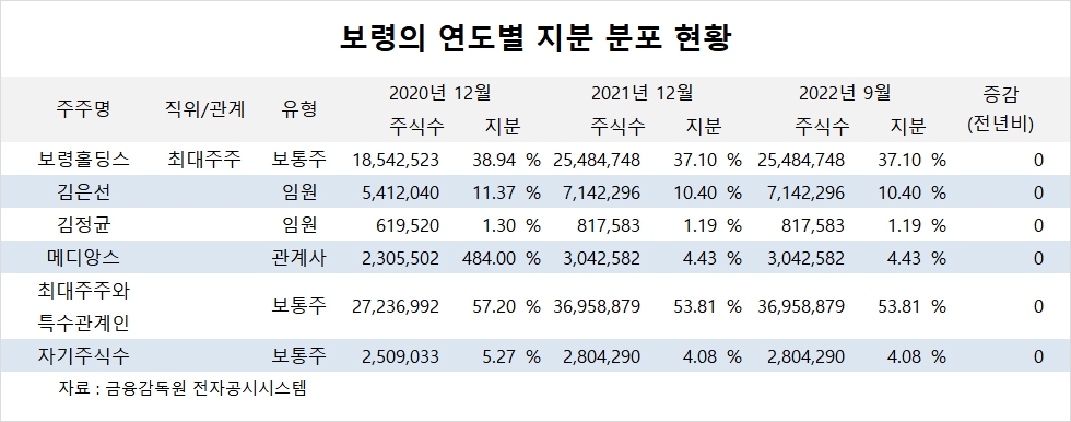 보령은 김은선 회장이 지분 10.43%, 김은선 회장의 외아들인 김정균 대표가 지분 1.19%를 소유하고 있습니다.