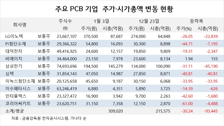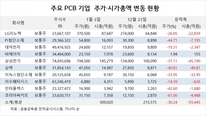 주요 상장 PCB 업체들의 시가총액은 올해 1월 3일 30조9020억원에서 12월 23일 21조5575억원으로 30.24%(9조3445억원) 줄었습니다.