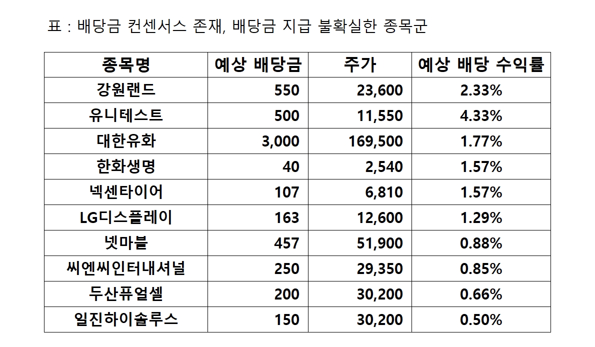 김종영 연구원은 "이와 같은 투자전략은 시장에서 배당 컨센서스는 존재하지만 배당주로 평가하지 않아서 배당락 당일 주가 회복도 빠르며, 차후 배당금을 받는 경우가 발생하기 때문"이라고 설명했다.