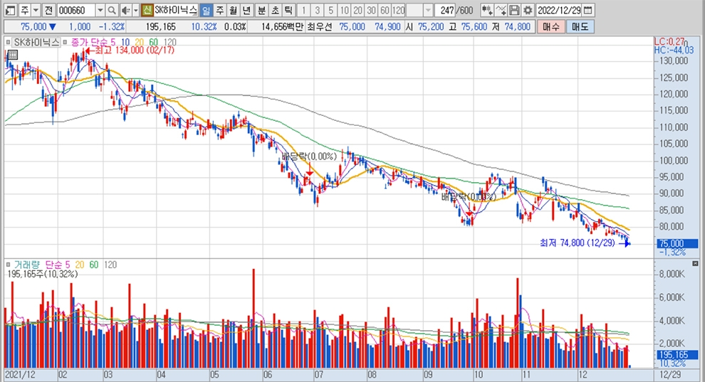 이미지 확대보기SK하이닉스는 경기 침체 우려에 따른 실적 부진으로 올해 폐장일인 29일에도 52주 신저가를 경신하며 나락으로 떨어졌습니다.