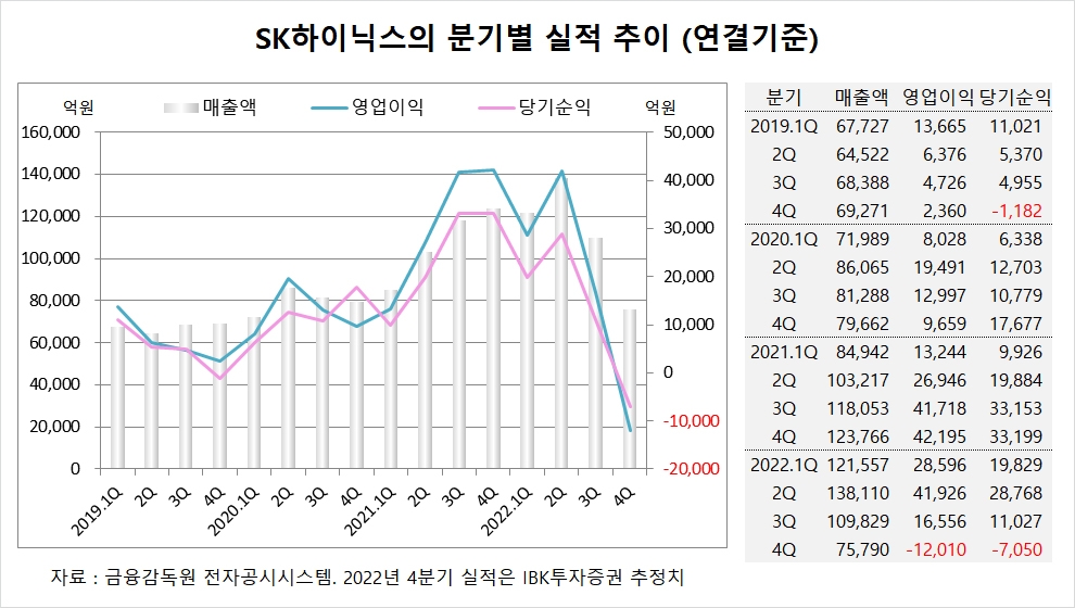 이미지 확대보기IBK투자증권은 SK하이닉스의 올해 4분기 연결기준 매출액이 7조5790억원, 영업이익이 –1조2010억원, 당기순이익이 –7050억원에 이를 것으로 전망하고 있습니다.