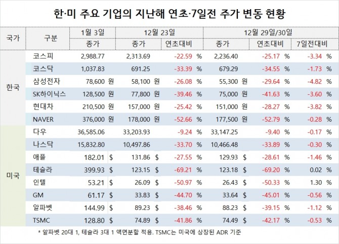 이미지 확대보기한국과 미국의 주요 기업 가운데 테슬라의 주가는 지난해 연초대비 69% 가량 떨어져 투자자들의 마음을 옥죄였고 네이버도 절반 넘게 반토막난 상태로 장을 마감했습니다.