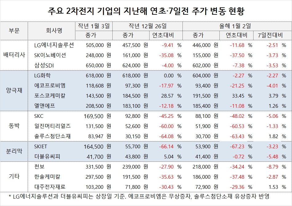 이미지 확대보기주요 2차전지 관련주들은 전기차 수요 둔화 우려에 주가가 급락하는가하면 지난해 4분기 기대치를 넘어선 호실적에 주가가 오른 곳도 있습니다.