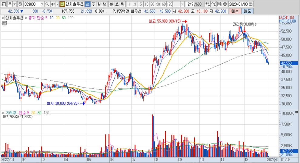 이미지 확대보기한화솔루션의 주가는 3일 오전 9시 40분 현재 전일보다 300원(0.70%) 내린 4만2550원에 거래되고 있습니다.