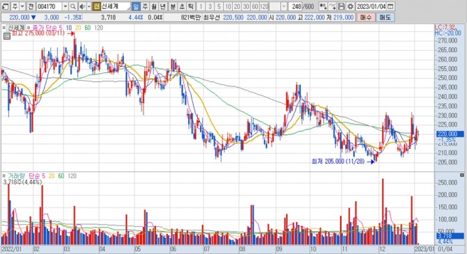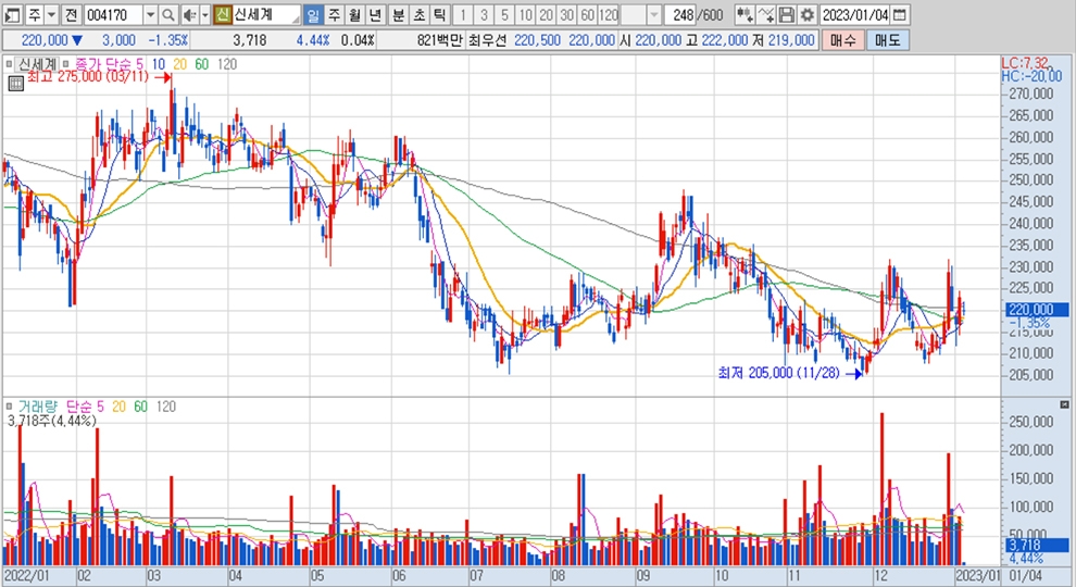 이미지 확대보기신세계의 주가는 4일 오전 9시 10분 현재 전일보다 3000원(1.35%) 내린 22만원에 거래되고 있습니다.