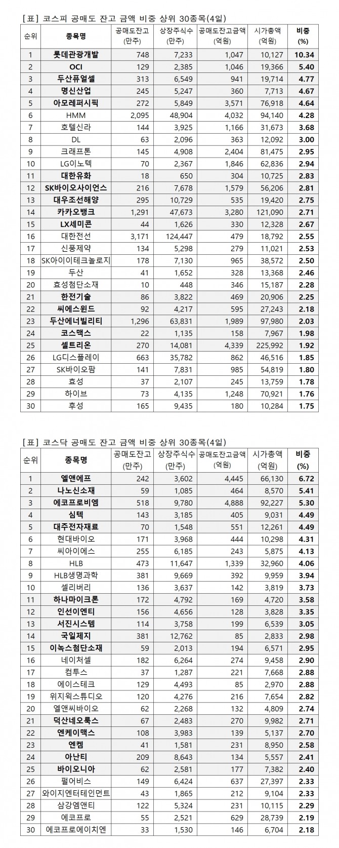 1위 롯데관광개발 1046억원(10.34%), 2위 OCI 1046억원(5.4%), 3위 두산퓨얼셀 941억원(4.77%), 4위 명신산업 359억원(4.67%), 5위 아모레퍼시픽 3571억원(4.64%), 6위 HMM 4032억원(4.28%), 7위 호텔신라 1165억원(3.68%), 8위 DL 362억원(3.0%), 9위 크래프톤 2404억원(2.95%), 10위 LG이노텍 1845억원(2.94%), 11위 대한유화 303억원(2.83%), 12위 SK바이오사이언스 1579억원(2.81%), 13위 대우조선해양 534억원(2.75%), 14위 카카오뱅크 3280억원(2.71%), 15위 LX세미콘 329억원(2.67%)