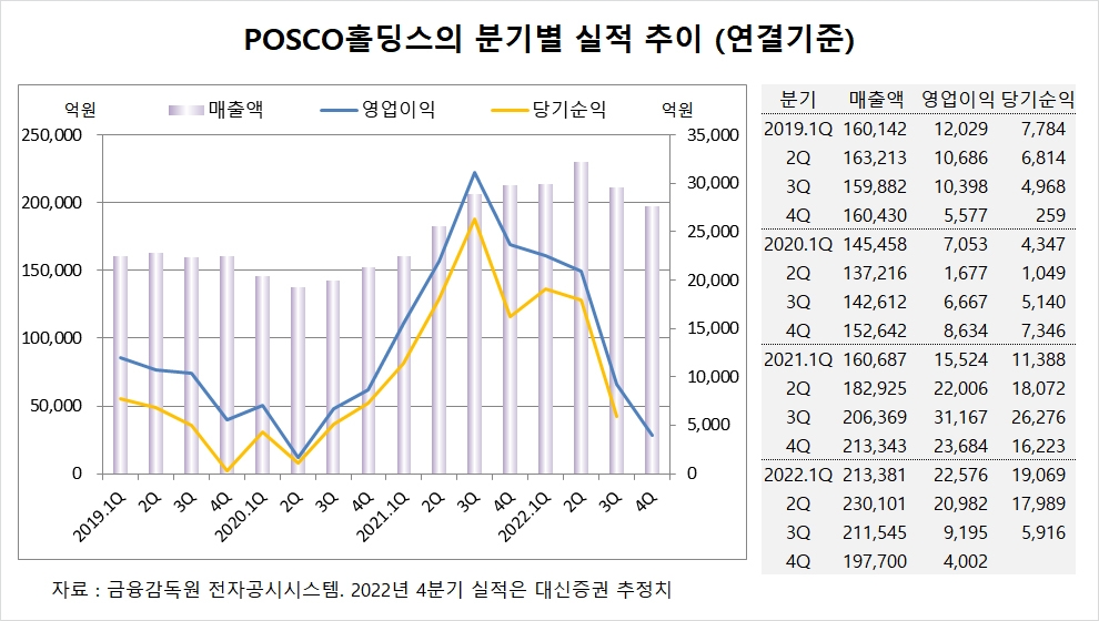 대신증권은 포스코홀딩스의 지난해 4분기 연결기준 매출액이 19조7700억원, 영업이익이 4002억원에 이를 것으로 내다보고 있습니다. 포스코홀딩스의 작년 4분기 영업이익은 시장 컨센서스인 5860억원을 하회할 전망입니다.