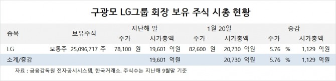 이미지 확대보기구광모 회장이 보유한 LG 주식의 시가총액은 지난해 말 1조9601원에서 올해 1월 20일 종가 기준 2조730억원으로 5.76%(1129억원) 증가했습니다.