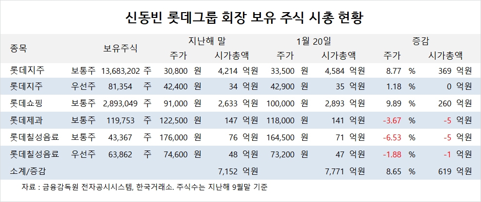 신동빈 회장이 보유한 주식의 시가총액은 지난해 말 7152억원에서 올해 1월 20일 종가 기준 7771억원으로 8.65%(619억원) 증가했습니다.