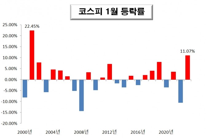글로벌이코노믹이 지난 2000년 이후 1월 등락률을 집계해 분석한 결과 1월 상승률 기준으로는 22.45%%를 기록했던 지난 2001년 1월 이후 22년여 만에 가장 높았다.