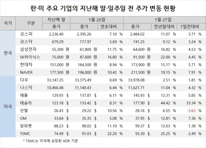 이미지 확대보기한국과 미국 주요 기업 가운데 테슬라의 주가는 지난해 말보다 44% 급등했고 삼성전자의 주가도 전년 말에 비해 16% 상승했습니다.