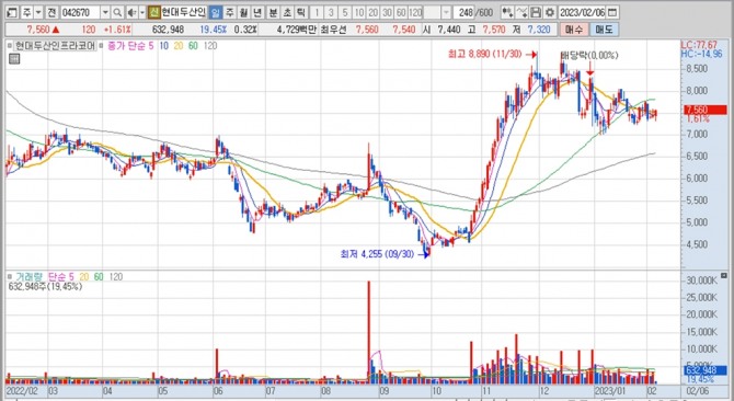 이미지 확대보기현대두산인프라의 주가는 6일 오전 9시 30분 현재 전일보다 120원(1.61%) 오른 7560원에 거래되고 있습니다.