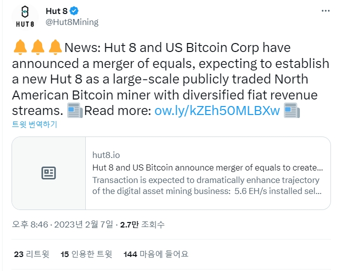 허트8은 공식 홈페이지를 통해 "허트 8과 유에스 비트코인(US Bitcoin)은 탁월한 디지털 자산 채굴, 호스팅, 관리형 인프라 운영 및 고성능 컴퓨팅 조직을 만들기 위한 동등한 합병을 발표한다"고 밝혔다.